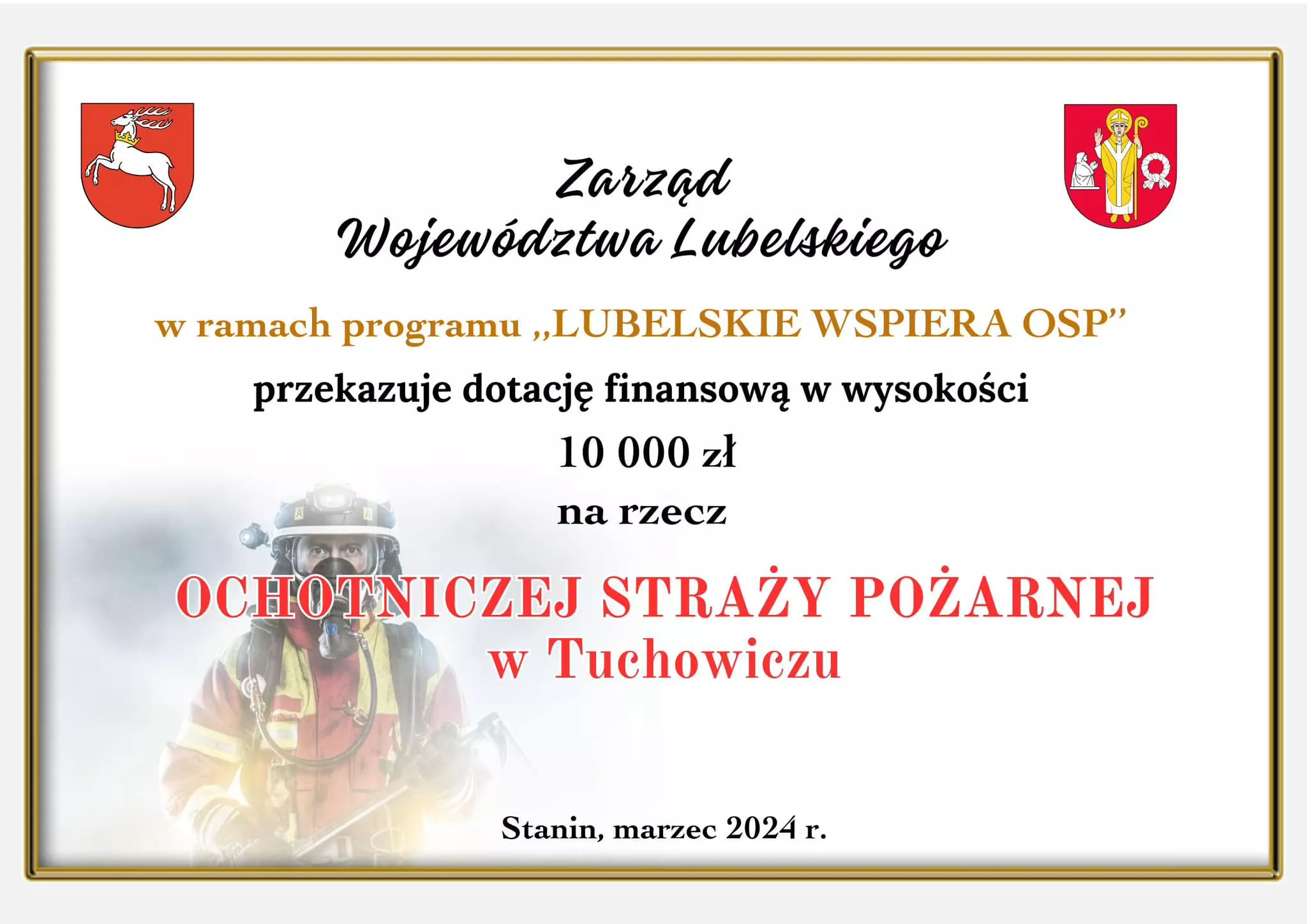 12.03.2024r. w budynku Gminnej Biblioteki Publicznej w Staninie odbyło uroczyste wręczenie promes z dotacjami dla Ochotniczych Straży Pożarnych z terenu naszej gminy. Dziękujemy władzom, wójtowi Krzysztof Kazana za docenienie naszych działań. Szczególne podziękowania kierujemy do vice wójta Sławomira Rzymowskiego , który poprowadził nam wszystkie niezbędne dokumenty dla uzyskania dotacji z programu "Lubelskie wspiera OSP" oraz Ryszard Szczygieł radnemu Sejmiku w. lubelskiego